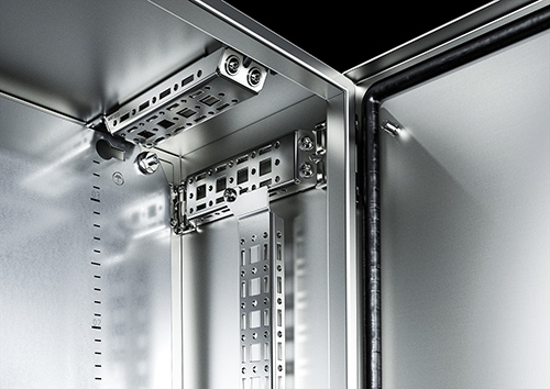 Der AX Edelstahl-Schaltschrank bietet aufgrund seiner robusten Edelstahlkonstruktion zuverlässigen Schutz vor äußeren Einflüssen wie Staub und Schmutz. Dank der Kombination von integrierten Gehäusenocken und Schiene für den Innenausbau verfügt der AX über die gleiche 25 mm-System-Rasterung wie Rittal Großschränke. Ohne Bohren lassen sich Systemkomponenten und -zubehör einfach, schnell und sicher einbauen und ermöglicht einen flexiblen Innenausbau. Die Erdung der Montageplatte mit automatischem Potenzialausgleich wird durch die Nutzung der Schlüssellochbohrung vereinfacht und ist auch nach Einbau der Montageplatte möglich.