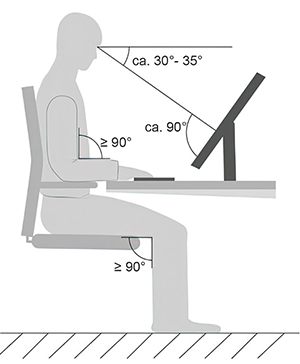 Um Stuhl und Arbeitsfläche ergonomisch ideal einzustellen und die Arbeitsmittel wie Bildschirm und Tastatur auf der Arbeitsfläche bestmöglich anzuordnen, sollte der jeweilige Mitarbeiter die Referenzsitzhaltung einnehmen.