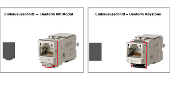 Unsere Module gibt es in verschiedenen Einbauausschnitten (MC Modul und Keystone). Bei den verschiedenen Applikationen (wie z. B. Anschlussdosen, Patchfeldern, Modulträgern, Tragschienengehäuse REGplus, Unterflureinheiten etc.) ist es Voraussetzung, dass der Einbauausschnitt der Applikation mit dem Einbauausschnitt des Moduls kompatibel ist. Bei der Auswahl des Moduls ist es daher wichtig, den jeweiligen Einbauausschnitt zu beachten. Alle Informationen hierzu finden Sie in der Produktbeschreibung.