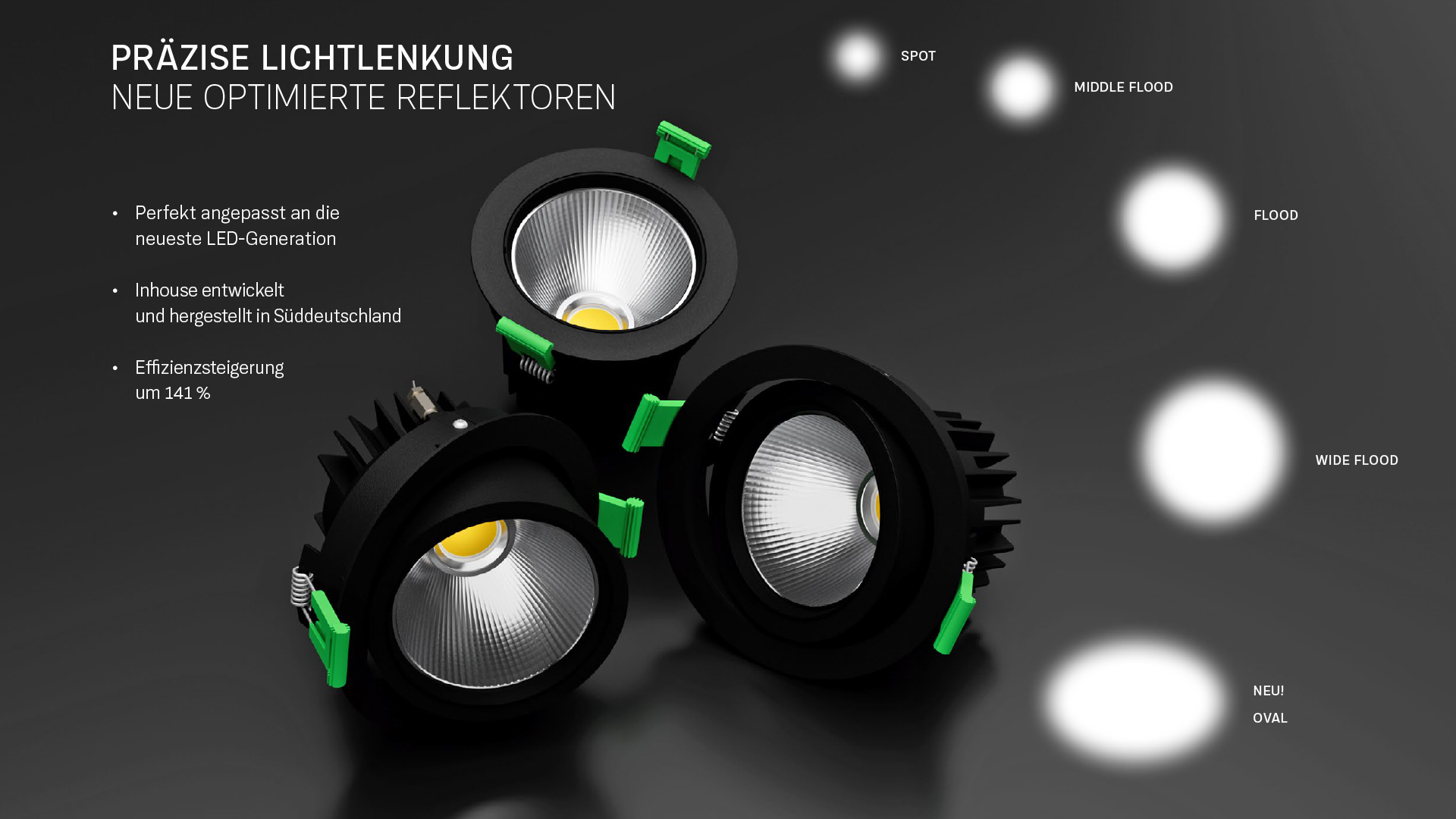 Neu ist, dass er optional mit einem innovativen ovalen Reflektor ausgestattet werden kann, der für die perfekte vertikale und horizontale Ausleuchtung auf der Verkaufsfläche sorgt. Interessant ist dies auch im Sinne der Kosteneffizienz und Nachhaltigkeit, denn für die Ausleuchtung der gleichen Fläche benötigt der ovale Reflektor des CSA weniger Lichtpunkte als ein runder Reflektor.
