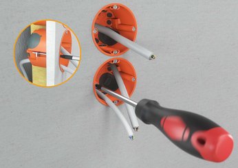 Ein umfangreiches Zubehörsortiment komplettiert sowohl das Unterputz- als auch das Hohlwanddosen-Portfolio. Das Zubehör ist optimal auf die jeweiligen Wanddosen abgestimmt und schafft Lösungen für nahezu jede Installationsherausforderung. Im Hohlwanddosen-Portfolio zählt das Zubehörteil für dünne Beplankungen zu den Highlights. Es eignet sich für den Einsatz in dünnen Beplankungen, wie beispielsweise Gasplatten, und sorgt dafür, dass die OBO-Hohlwanddosen so bereits ab einer Beplankungsstärke von 0,2 mm einsetzbar sind. Ein ähnlich kleiner Problemlöser mit großer Wirkung ist die Schnellfixierung Quick-Fix aus dem Unterputz-Portfolio. Mit ihr können die Unterputzdosen schnell und unkompliziert befestigt werden – und das ganz ohne Gipsen oder Kleben.