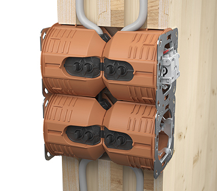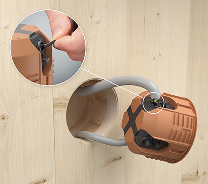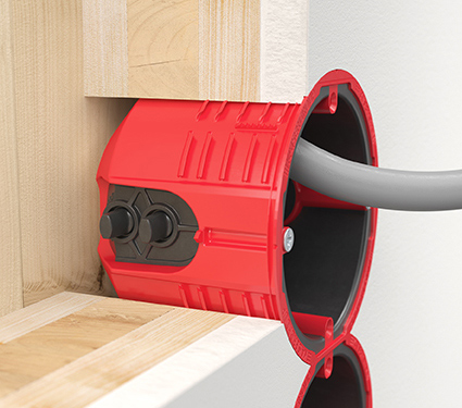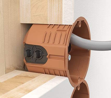 Während im Fertighausbau von Ein- und Zweifamilien-Häusern vorwiegend Holzrahmen- oder Holztafel-Bauweisen genutzt werden, bei denen für die Elektro-Installation Hohlwanddosen zum Einsatz kommen, sind beim Einbau in Massivholzelemente andere Lösungen gefordert. So erfolgt die Befestigung der Dose hier nicht hinter der Beplankungsebene, sondern in der Bauteilöffnung. Jedoch muss bei Massivholz zusätzlich die Leitungsführung innerhalb des industriell hergestellten Elements beachtet werden. Da die Leitungen durch senkrechte oder waagerechte Bohrungen in das Wandelement eingebracht werden und bei einer Installationstiefe von nur 30 mm auf die Dose zukommen, müssen die Leitungseinführungen darauf ausgerichtet sein.