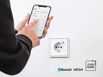 Von der Steckdose mit Energiemessfunktion bis zum Raumthermostat – in JUNG HOME kommunizieren alle Komponenten drahtlos miteinander. Der sichere, weltweite Funkstandard Bluetooth® Mesh macht’s möglich. Um die Installation zu vereinfachen, tauschen die Geräte drahtlos Informationen aus. Dabei kommt der Funkstandard Bluetooth® Mesh SIG zum Einsatz, eine Erweiterung des millionenfach bewährten Bluetooth-Protokolls. Als einzige Bluetooth-Variante in der Gebäudetechnik ist sie von der offiziellen Bluetooth® Special Interest Group (SIG) standardisiert – Voraussetzung für einen reibungslosen, herstellerübergreifenden Betrieb.