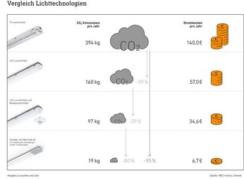 Im Vergleich der Lichttechnologien zeigt sich, dass die RS PRO 5100 SC mit Abstand den kleinsten ökologischen Fußabdruck aufweist. Die CO2-Emissionen sind nachweislich 20-mal geringer als bei einer herkömmlichen T8-Leuchtstoffröhre. Pro Leuchte werden mehr als 130 € Strom pro Jahr gespart. Auch der Wechsel von einer LED-Leuchte ohne Sensor zu einer Sensor-LED-Leuchte spart pro Jahr 141 kg CO2 und 63,30 € Strom. Die Installation der RS PRO 5100 SC bietet Parkflächenbetreibern damit echte Renditechancen. Zudem ist die Lichtlösung von STEINEL BEG-förderfähig.