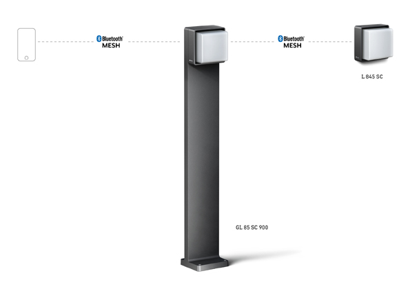 Zur Beleuchtung größerer Flächen können mehrere Lichtwürfel per Bluetooth Mesh kabellos miteinander vernetzt werden, ganz ohne zusätzliche Hardware. Einzige Voraussetzung ist die Nutzung der kostenlosen STEINEL Connect App für iOS und Android. Sie ermöglicht die Bildung von Funktionsgruppen, denen bestimmte Einstellungen für die Lichtschaltung zugewiesen werden. Die so miteinander verbundenen Leuchten agieren dann wie eine Gesamtleuchte. Dank der Nachbarfumktion können benachbarte Lichtgruppen aktiviert werden. Das Licht denkt quasi voraus und begleitet eine Person auf ihrem Weg. Licht ist immer genau dort, wo es benötigt wird. Wege und sonstige Außenbereiche sind somit gleichmäßig und sicher ausgeleuchtet.