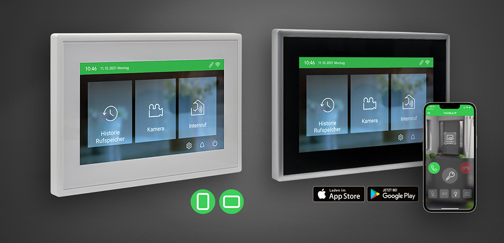 Komfortable Türkommunikation sowohl von Zuhause als auch von unterwegs per App für Android und iOS möglich. Die TwinBus IP App ist vollkommen kostenlos und bietet Datensicherheit mit Serverstandort in Deutschland