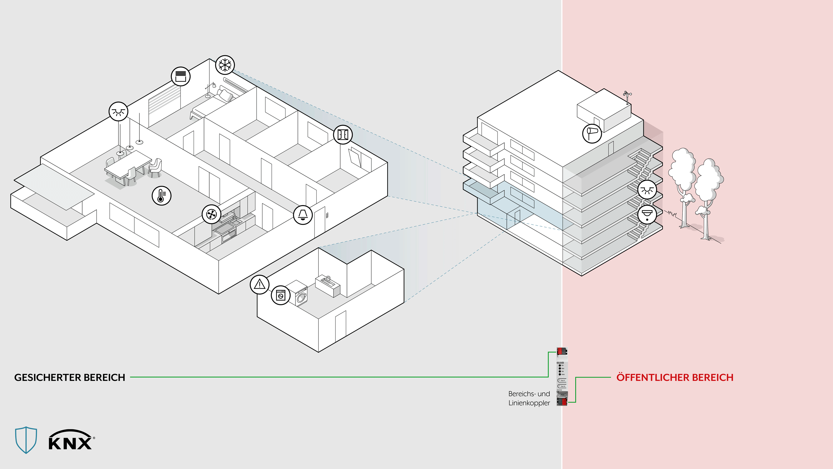 Für eine vollständig verschlüsselte Kommunikation müssen alle Geräte eines Systems KNX Data Secure verwenden. Es kann jedoch vorkommen, dass nicht alle Komponenten in der Lage sind, mit KNX Data Secure zu kommunizieren. Ein weiterer Anwendungsfall kann eintreten, wenn eine bestehende KNX Anlage mit KNX-Secure-Produkten erweitert werden soll. In beiden Fällen besteht die Möglichkeit, die Anlage so zu strukturieren, dass die KNX-Data-Secure-fähigen Geräte und die Produkte ohne KNX Secure in getrennten Segmenten angeordnet werden. Der JUNG KNX Bereichs- und Linienkoppler verbindet diese beiden Bereiche, wenn in der ETS Secure aktiviert ist, kann die Funktion Secure Proxy verwendet werden. Diese Funktion übersetzt die Telegramme mit Gruppenadressen in beiden Richtungen zwischen gesicherter und ungesicherter Übertragung. Für die einzelnen Sensoren oder Aktoren ist der Unterschied nicht erkennbar.